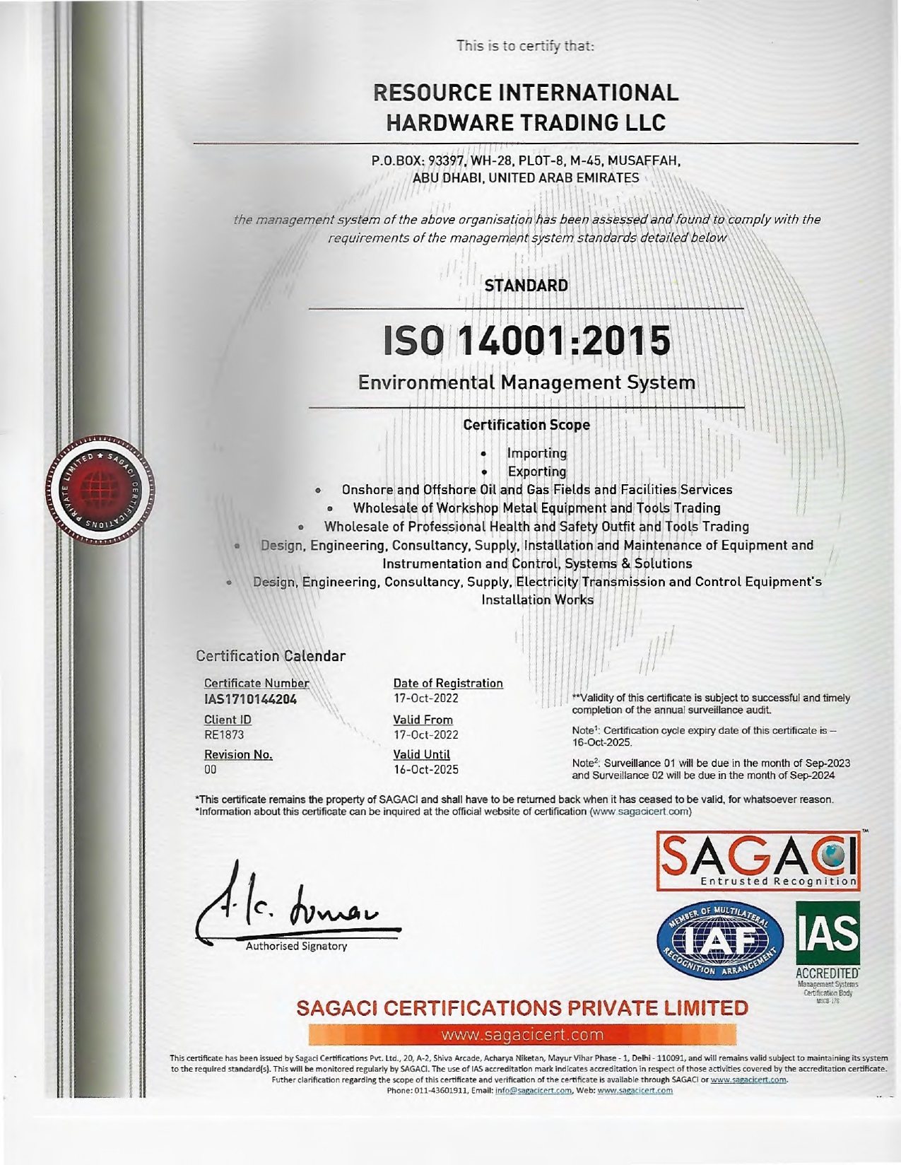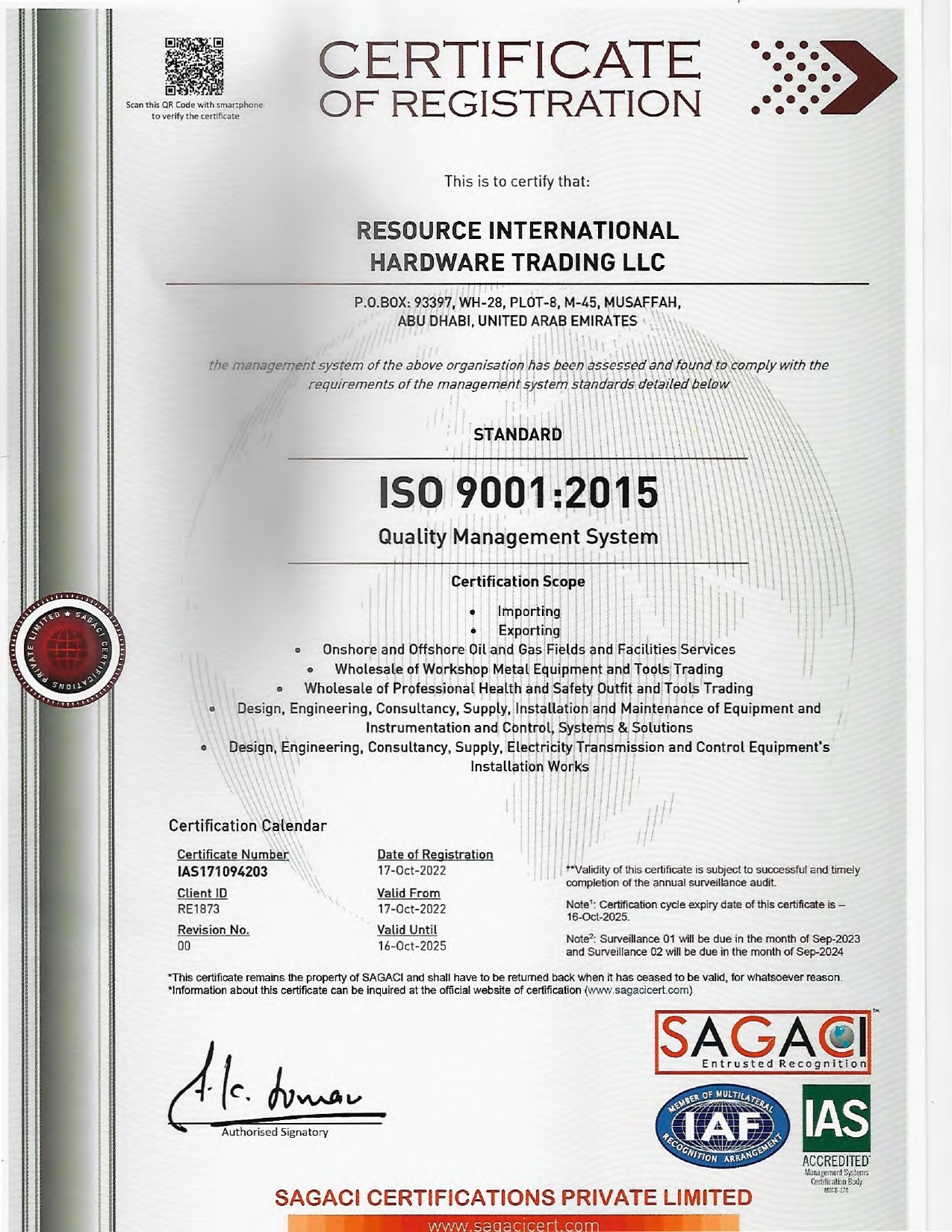 Resource International committed to provide quality products on time to meet customer satisfaction. The management has established, documented, implemented & maintained quality management system and continually improves its effectiveness covering the requirements of ISO 9001: 2015, ISO 14001:2015, and ISO 45001:2018. It also follows AQL 6.5 level for all its goods.