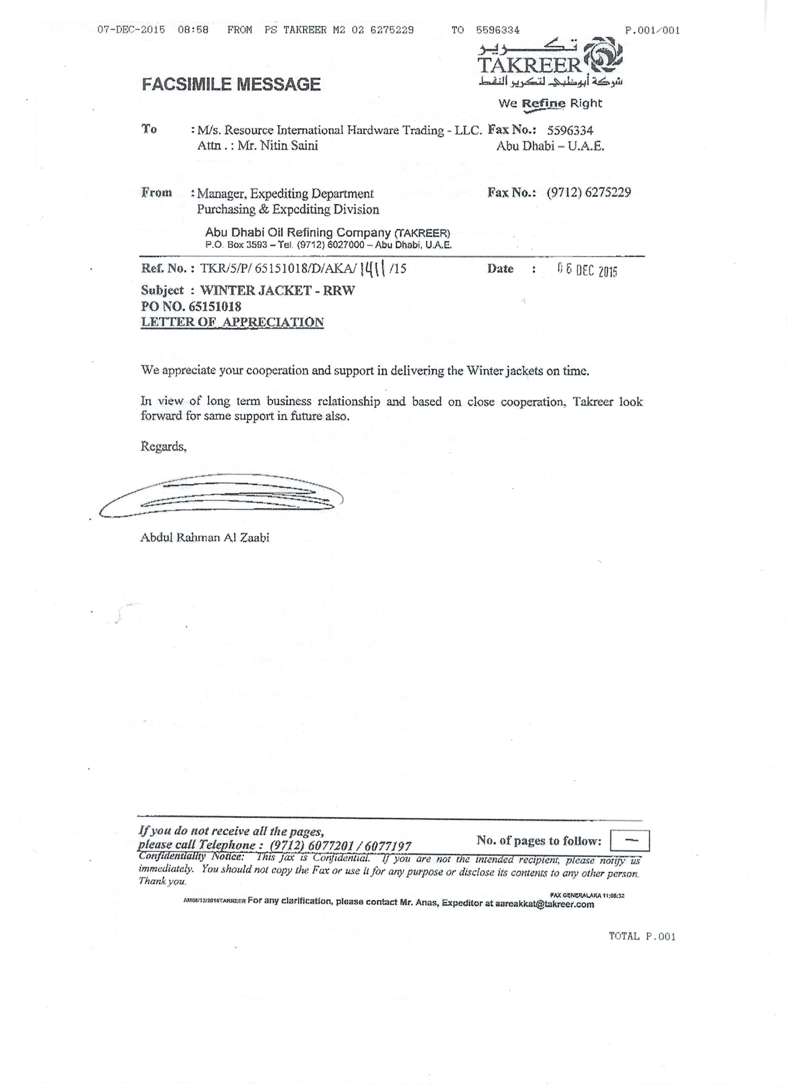 ADNOC refining company, a valued client, sent an appreciation letter to Resource International for providing the quality product that they request on time. We commit our best service in order to build a long term business relationship with all our customers.